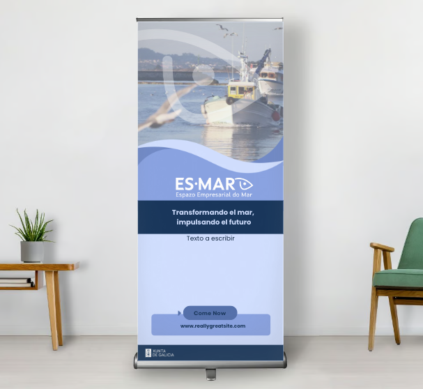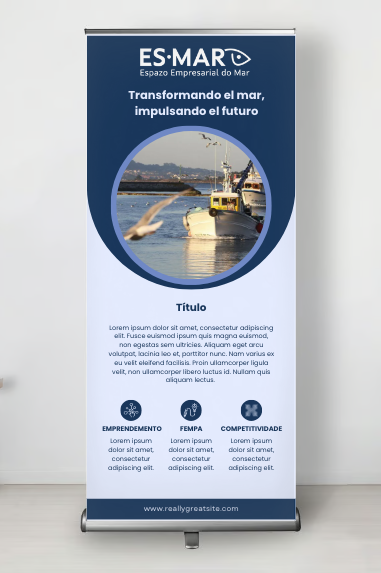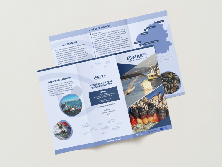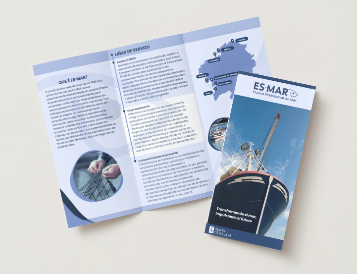 El proyecto ES-MAR (Economía Azul de Galicia) realizado en colaboración con mi compañera Fatima Failde , es un ejemplo de cómo una identidad visual trabajada puede conectar sectores tradicionales como la pesca y la acuicultura con la innovación y el emprendimiento moderno.